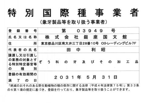 (株)銀座国文館は、象牙製品の取扱いを行う事業者として認定及び登録を完了しております。